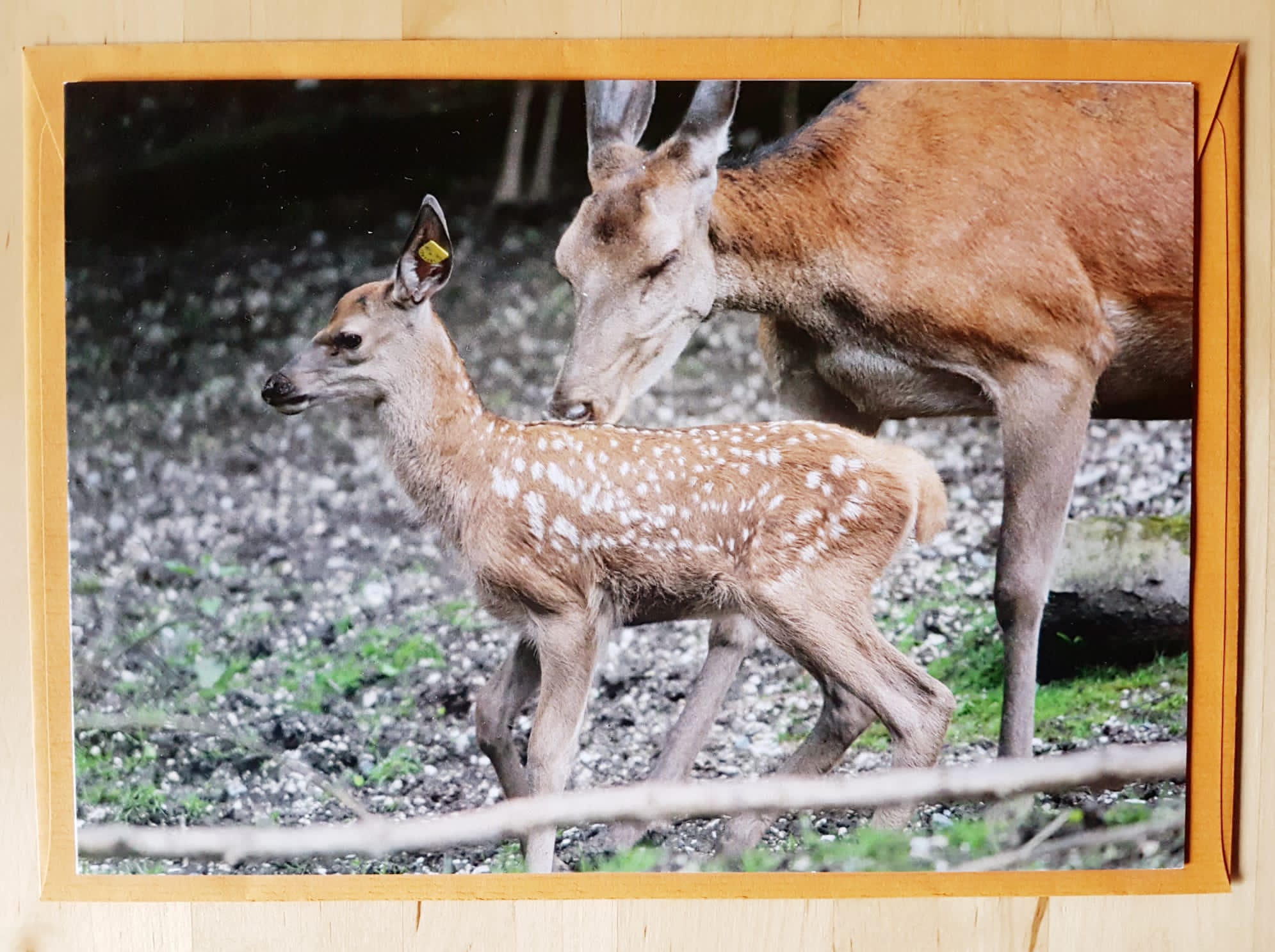 Fotokarte - Family: sehr schönes Motiv von Mutterkuh und Kalb, Doppelkarte Format A5, mit farblich assortiertem Couverts