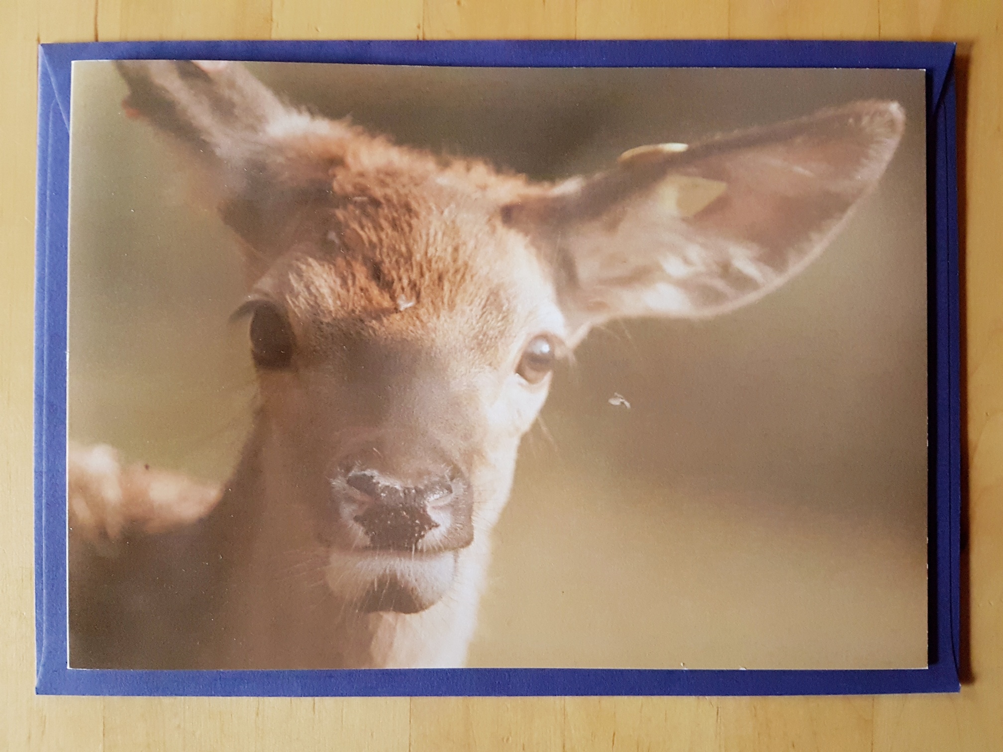Fotokarte Leon, das verträumte Hirsch-Kalb als schöne Doppelkarte A5.